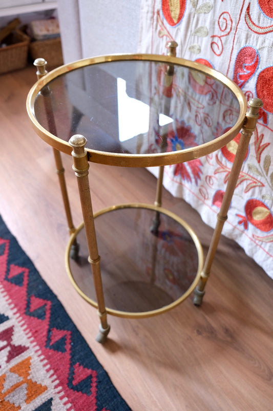 Mid-century drinks trolley/side table with wheels. Brass and smoked glass